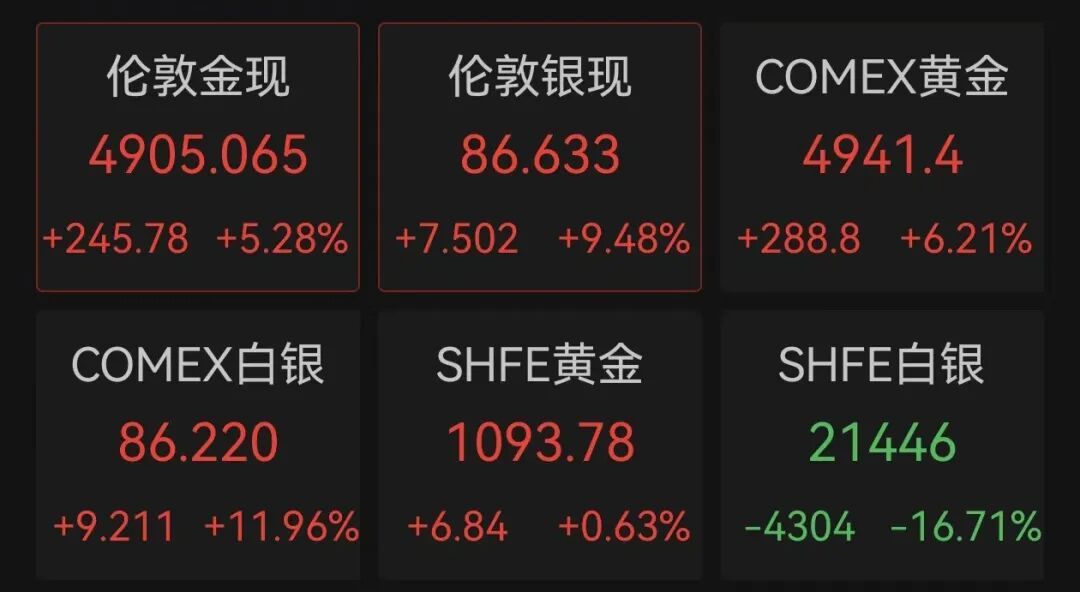 消息面上,黄金、白银今日大幅上涨。截至北京时间16:05,伦敦金现上涨5.28%,报4905.065美元/盎司,重回4900美元上方;COMEX黄金上涨6.21%,报4941.4美元/盎司。伦敦银现上涨9.48%,报86.633美元/盎司;COMEX白银上涨11.96%,报86.22美元/盎司。