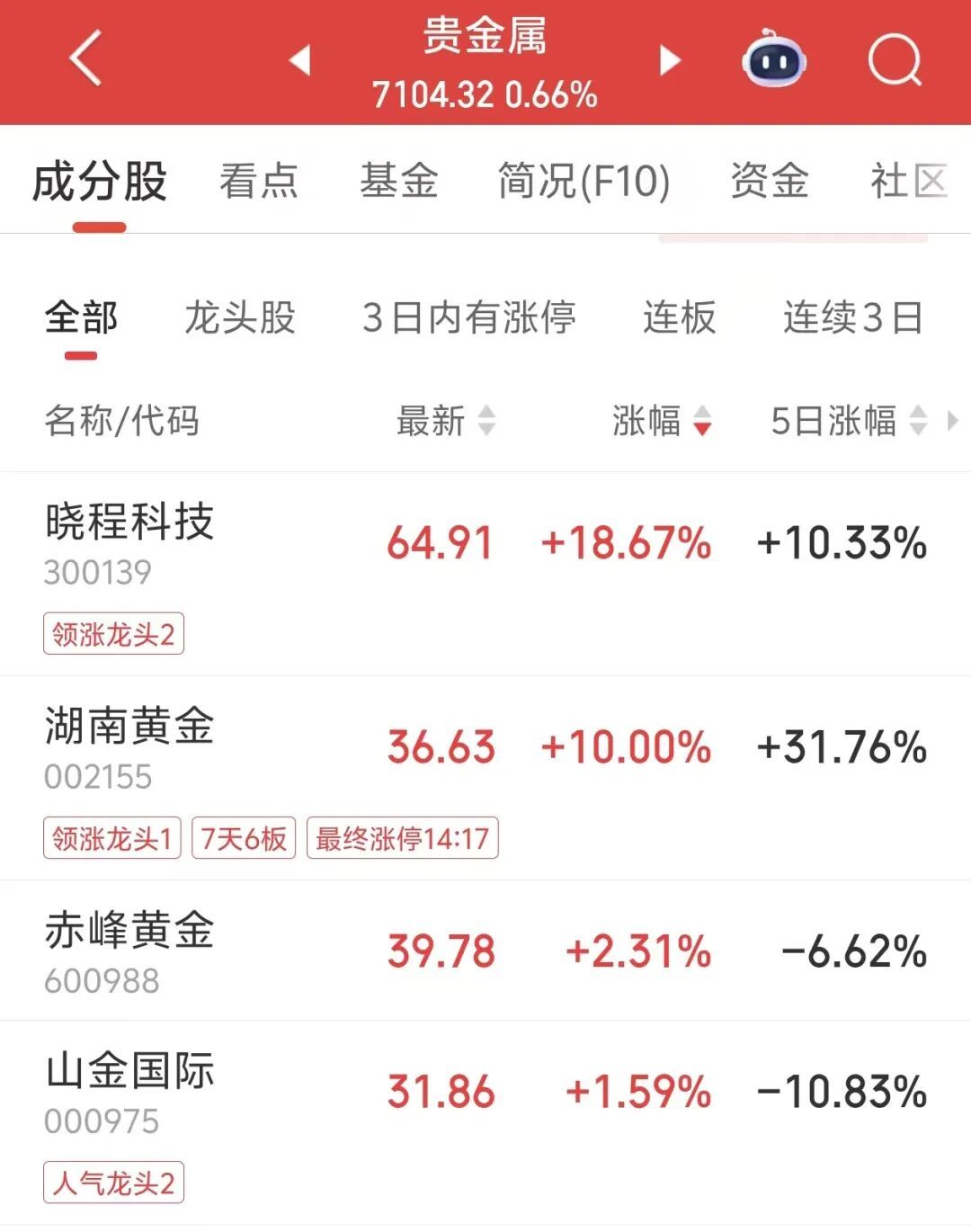 今日午后,贵金属概念部分回暖,晓程科技涨超18%,湖南黄金涨停,实现7天6板。