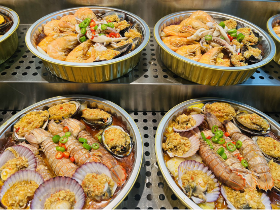 海鲜消费场景创新方面,“海鲜家庭分享桶”与“元气蒸”项目形成互补。前者现场加工鲜活食材,后者即时蒸煮贝类与虾蟹,传递后厨烟火感,提升消费体验。