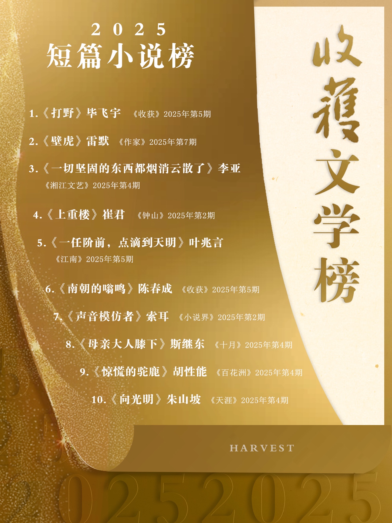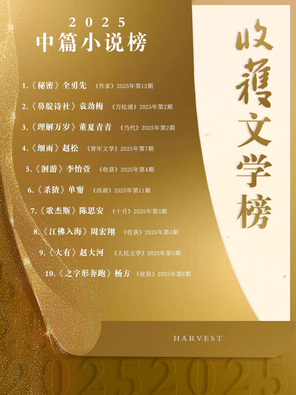 2月3日下午,2025年收获文学榜于上海正式揭晓,共有5部长篇小说、5部非虚构作品、10部中篇小说及10部短篇小说入选榜单。