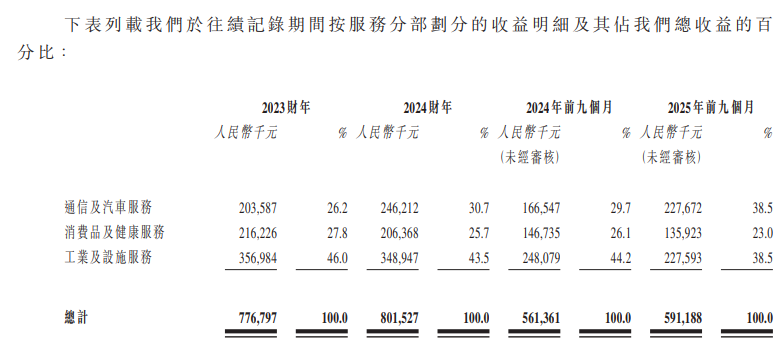拆分各业务板块来看,钛和检测核心业务的表现有好有坏。作为公司重点发展的通信及汽车服务板块,虽然在2025年前九个月实现收益同比增长36.7%,达到2.28亿元,但工业及设施服务板块却出现同比下滑8.3%的情况,消费及健康服务板块也同比下降了7.4%。