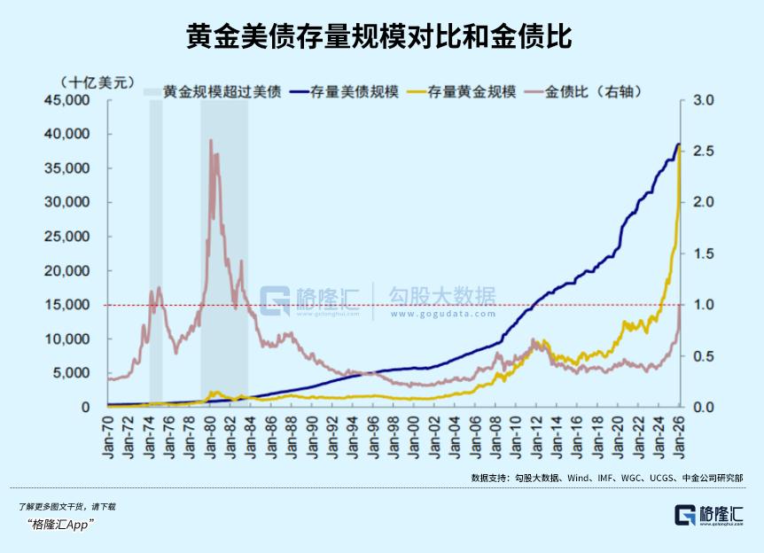 更关键的是美元信用正在松动。当前全球黄金总价值(38.2万亿美元)已接近美债规模(38.5万亿美元),这是80年代以来首次出现的情况。曾经美元占据主导地位,美债是硬通货,如今黄金能与之“平起平坐”,说明市场对美元的信任度有所下降——就像过去大家都认可一家银行的存单,现在却开始将资金换成黄金避险,信号十分明确。