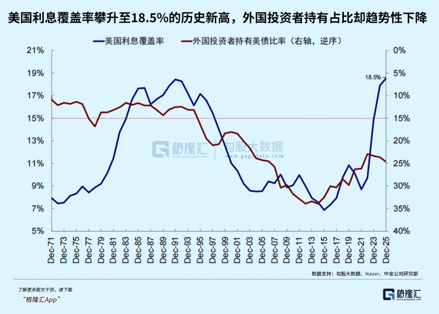 正如中金研究指出,当前美国陷入低通胀、低利率、美元霸权“三选二”的核心困境,无法同时实现三大目标。沃尔克曾以牺牲低利率为代价重塑美债信任,但如今美债存量(38.5万亿美元,占GDP122%)和利息覆盖比率(19.8%)远超1979年水平,该路径难以复制。庞大债务规模与高昂付息压力,让美国重塑美债信任需付出巨大代价,大幅加息这一历史手段已不具备可行性。