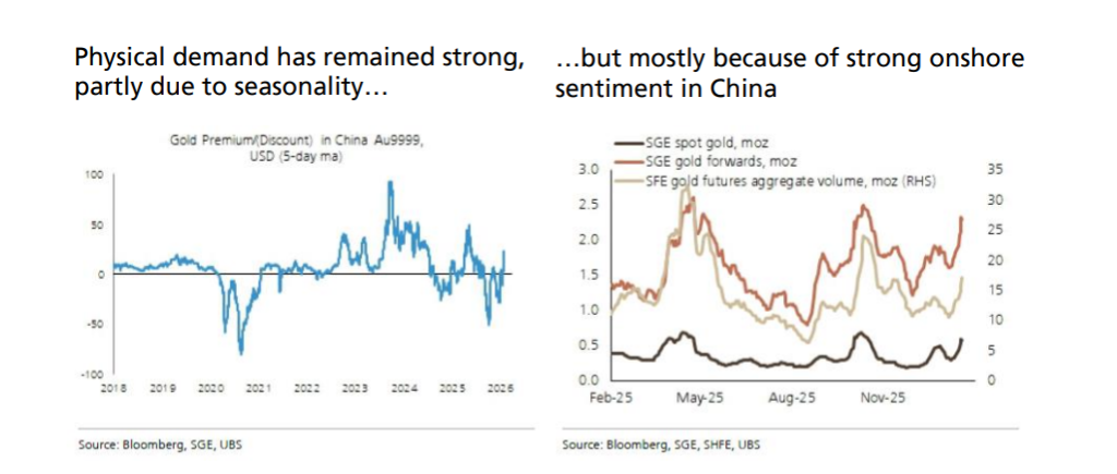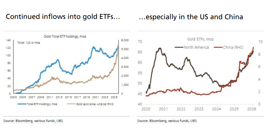 离岸避险情绪:瑞银分析称,中国在岸市场强烈的资产保值诉求,驱动资金疯狂涌入黄金ETF。数据显示,中国已成为当前全球黄金ETF净流入的最强引擎,这种由“避险+资产轮动”驱动的买盘,比传统的礼品消费更具持续性和规模效应。