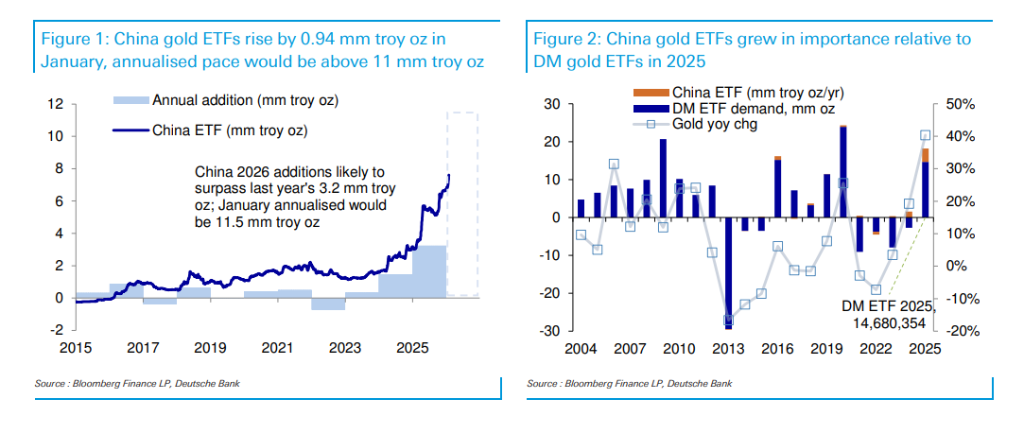 数据显示,仅2026年1月,中国黄金ETF的增持量就达到94万盎司。德银分析师Michael Hsueh指出,如果按此速度估算全年,2026年中国黄金ETF的增持量或将达到1150万盎司。