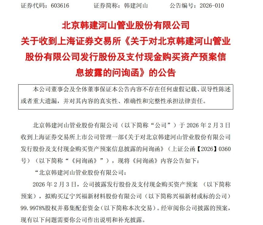 在同一天的晚间,韩建河山发布公告称,2月3日,公司收到了上海证券交易所公司管理一部下发的《关于对北京韩建河山管业股份有限公司发行股份及支付现金购买资产预案信息披露的问询函》。