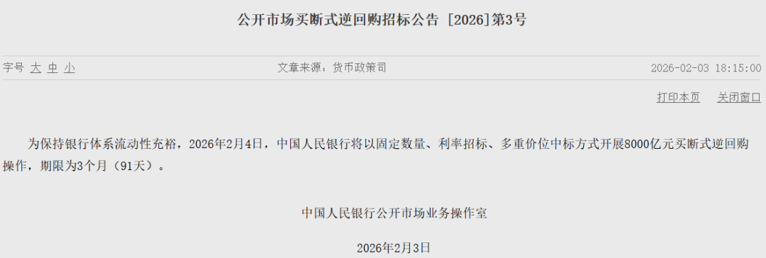 中国人民银行(以下简称“央行”)于2月3日发布公告,宣布将于2月4日通过固定数量、利率招标、多重价位中标方式,开展规模达8000亿元的3个月(91天)期买断式逆回购操作。由于本月有7000亿元买断式逆回购到期,此次操作后央行将实现1000亿元的资金净投放。