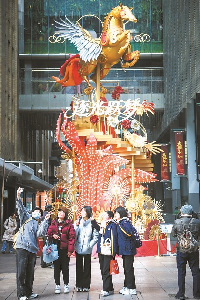 游客在南京路步行街打卡马年美陈。 海沙尔 摄