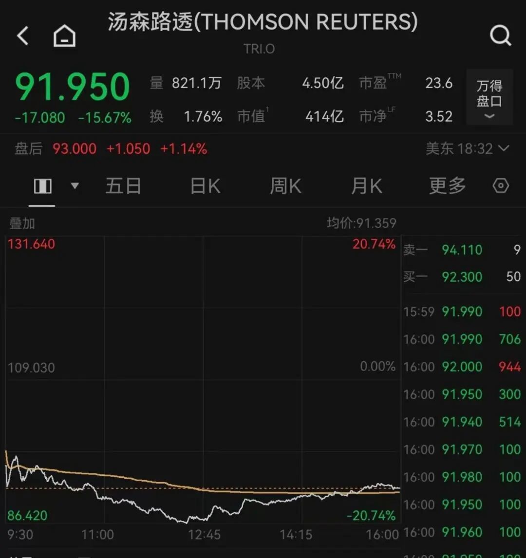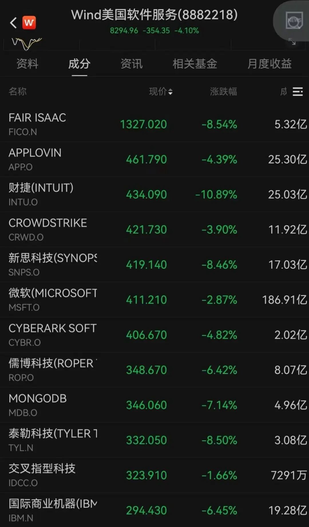 汤森路透盘中跌幅一度高达20.7%,最终收跌超15%。Wind美国软件服务指数当日下跌4.10%,成份股全线飘绿。