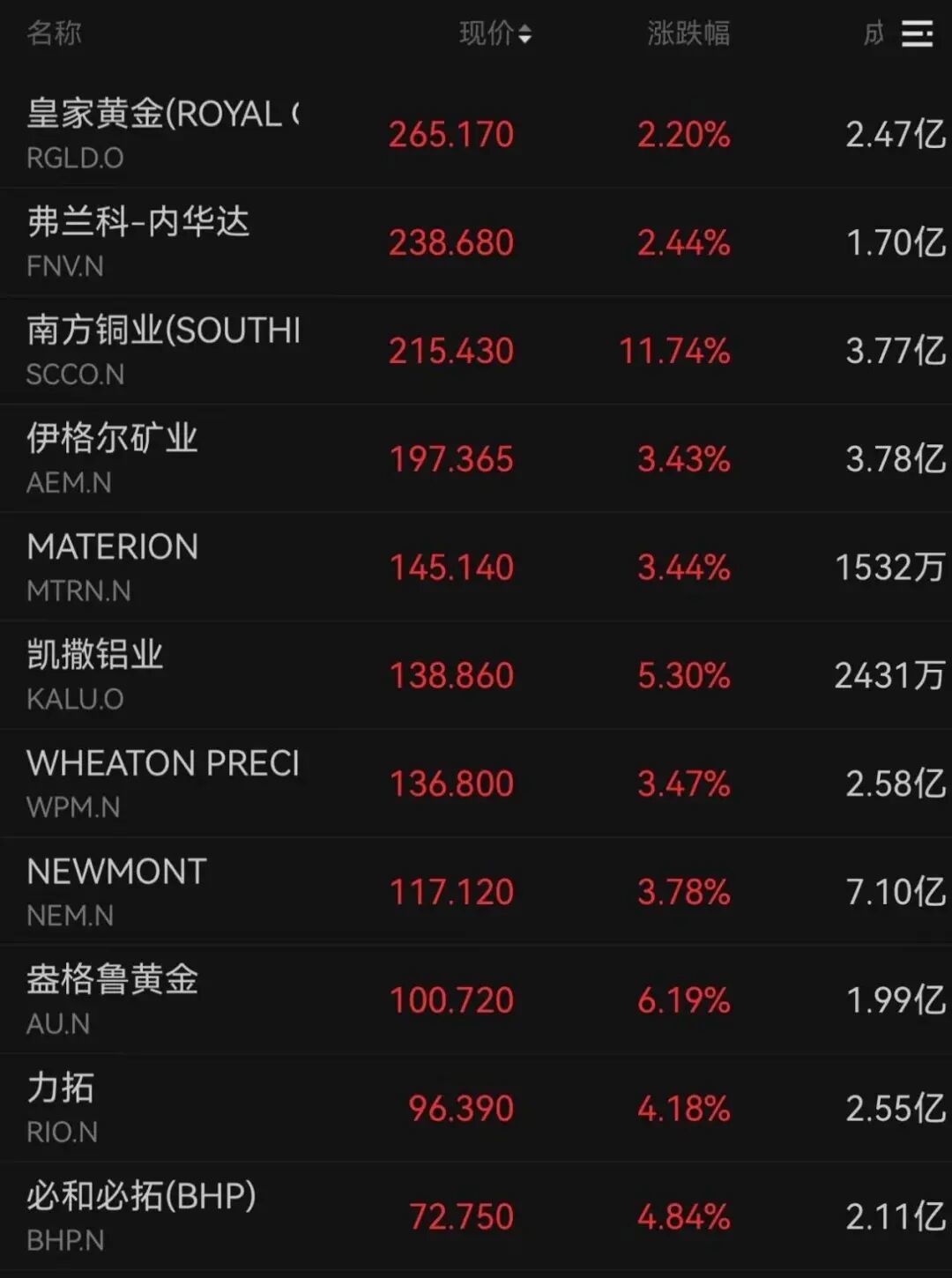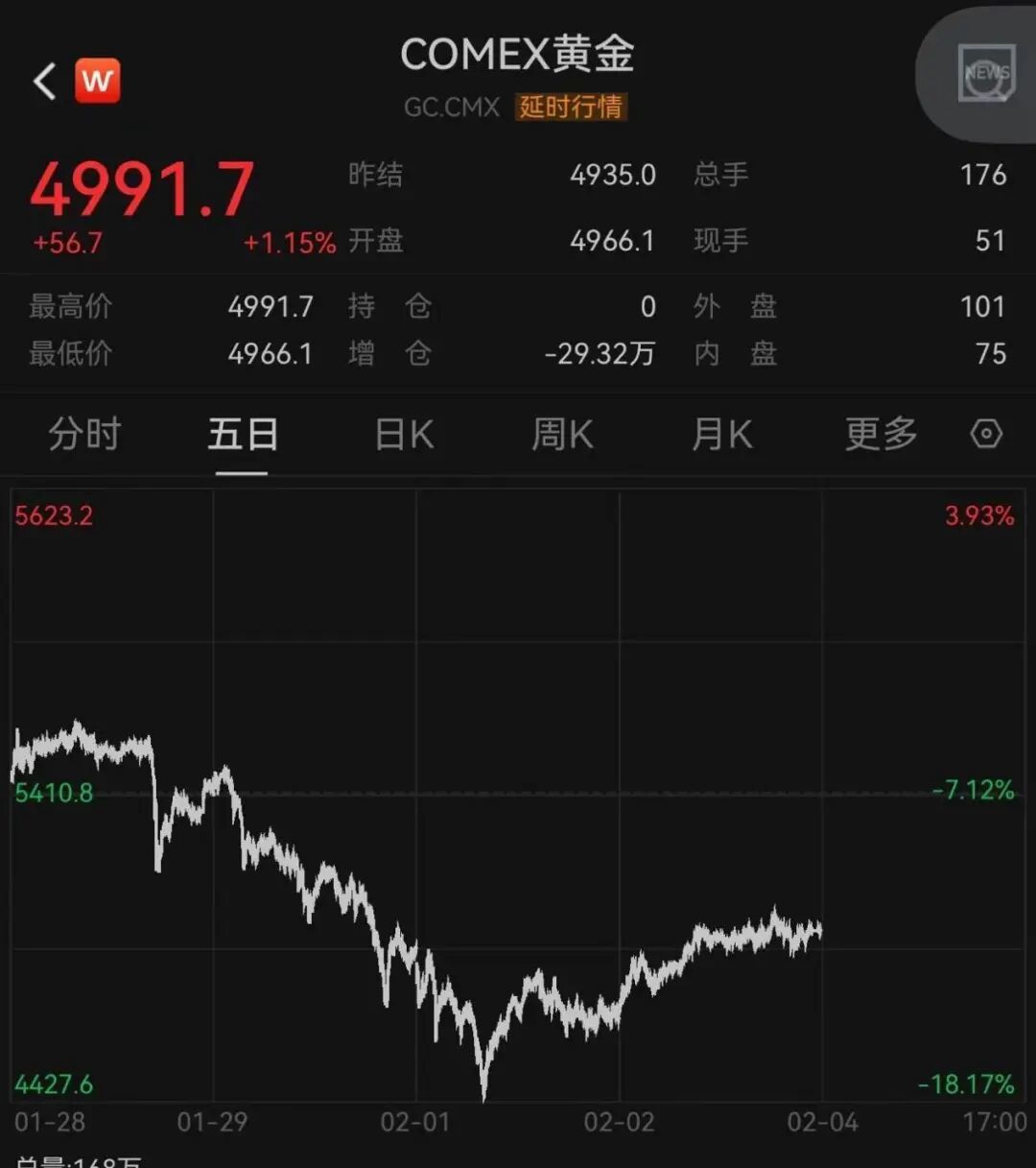 在经历前期急跌后,国际金价周二出现反弹。COMEX黄金期货价格逼近5000美元/盎司关口。美股市场有色板块同步走高,南方铜业涨幅超11%,盎格鲁黄金涨超6%,力拓、必和必拓等矿业巨头涨幅均超4%。