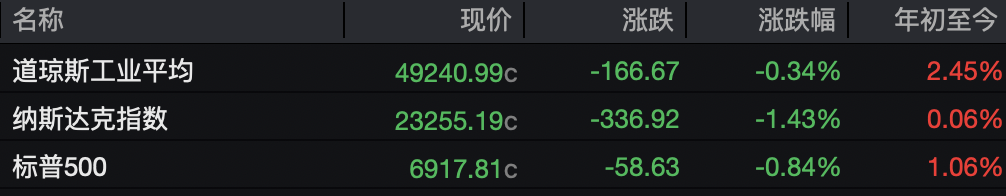 收盘数据显示,标普500指数下跌0.84%,报6917.81点;纳斯达克综合指数跌1.43%,报23255.19点;道琼斯工业平均指数小幅下跌0.34%,报49240.99点。至此,纳斯达克指数开年以来的涨幅已几乎被全部抹去。