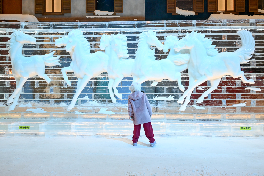 雪场内,一座以《八骏图》为灵感打造的全国首座巨型冰雕艺术墙引人注目。这座冰雕由1300块冰块拼接而成,总重量达百吨,八匹骏马造型栩栩如生,在灯光的映照下更显熠熠生辉;旁边的“步步登高”主题冰雕,则成为了寓意“财运亨通步步高”的新春讨彩头热门打卡点。