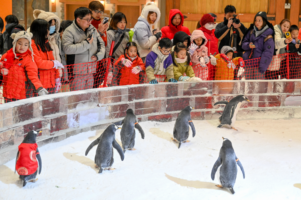 除此之外,耀雪冰雪世界还原汁原味地引入了东北雪乡和新疆阿勒泰地区的特色年味体验项目。南方游客得以首次在冰天雪地中见到非遗皮毛雪板,品尝到地道的饺子与元宵,还能零距离观看极地企鹅巡游,感受跨越地域的多元文化魅力。