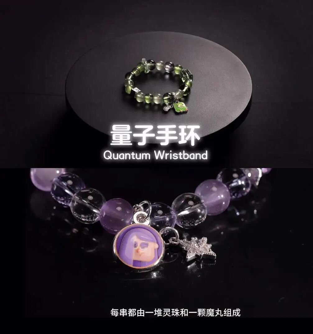 多儿款是绿色,拽姐款为紫色。多邻国介绍说,绿色清新治愈,能让人时刻充满活力;紫色则雅致神秘,自带淡定气场。手链的串珠是琉璃材质,吊坠为合金,珠子直径10mm。