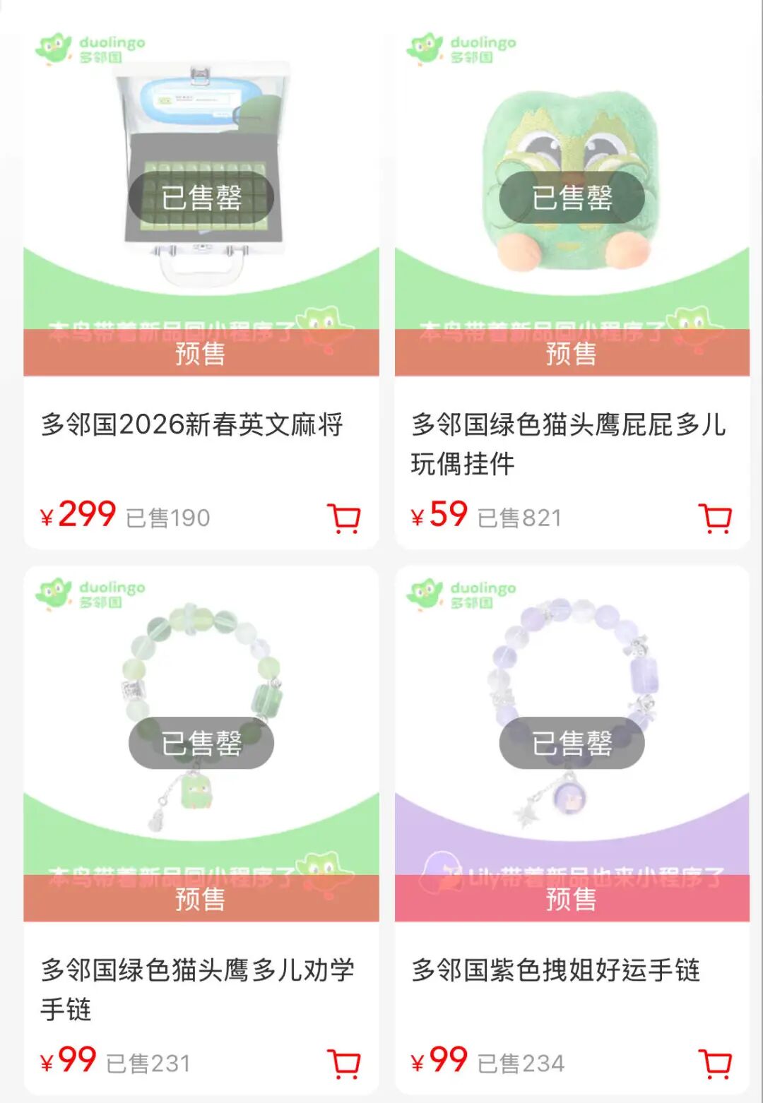 2月2日晚,四款商品在微店就全部售罄了。到2月3日下午,多邻国线上微店的数据显示:麻将售出190套,多儿挂件售出821套,多儿劝学手链售出231套,拽姐好运手链售出234套。