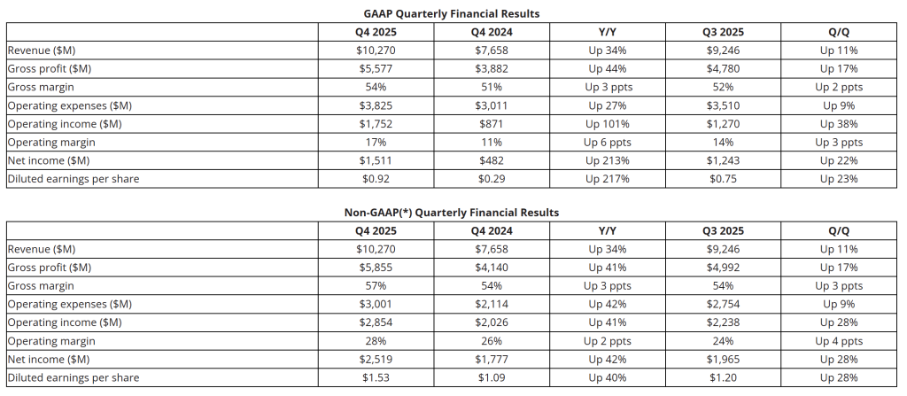 当地时间2月3日,AMD披露2025年第四季度财报:营收102.70亿美元,同比增34%,高于市场预期的96.7亿美元;GAAP净利润15.11亿美元,较上年同期的4.82亿美元大增213%;Non-GAAP每股摊薄收益1.53美元,超过预期的1.32美元。