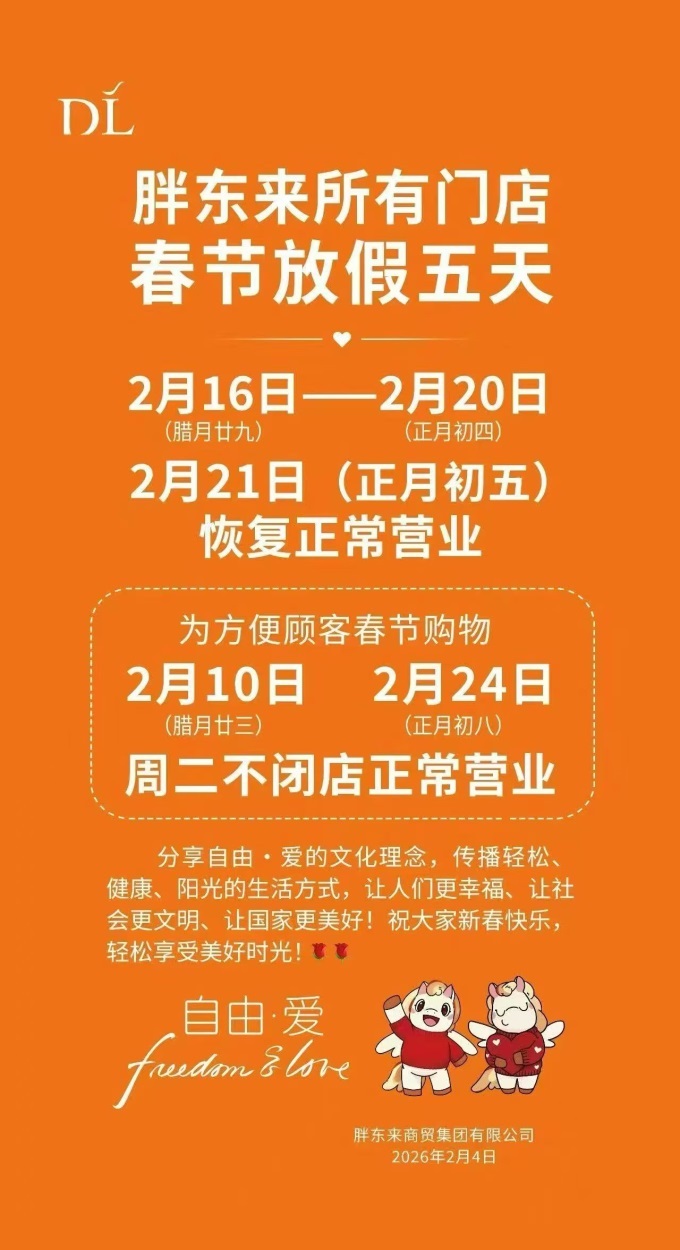 联商快讯:2月4日,胖东来公布2026年春节放假方案:所有门店将于2月16日(腊月二十九)至2月20日(正月初四)闭店五天,2月21日(正月初五)恢复营业。为兼顾顾客购物需求,2月10日(腊月廿二)、2月24日(正月初八)取消常规周二闭店,门店正常运营。