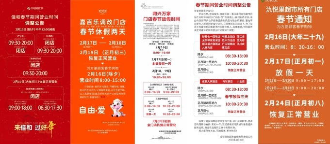 成都邻你超市:成都大庆路店、马尔康店、小金店2月17日(正月初一)至19日(正月初三)闭店三天;2月16日(除夕)、2月20日(正月初四)至22日(正月初六)缩短营业时间;2月23日(正月初七)全部门店恢复正常;