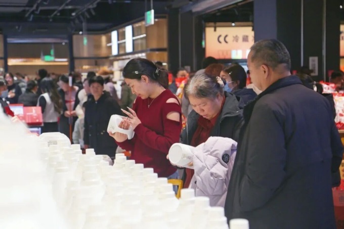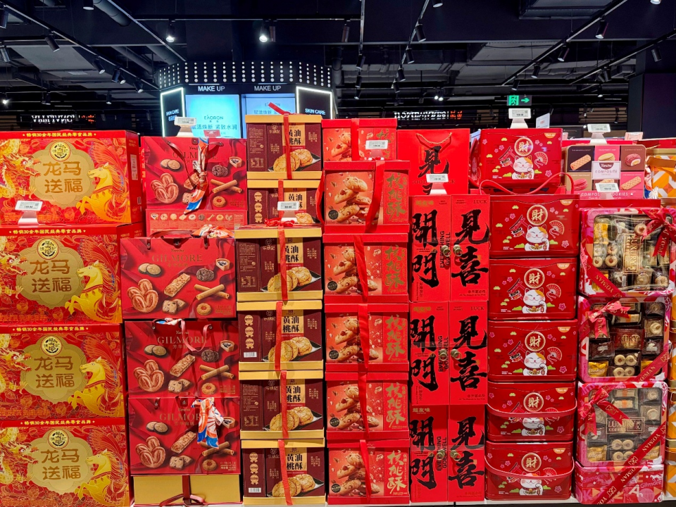 随着春节的临近,超市内的年味愈发浓郁,从新鲜的生鲜食材到精美的节庆礼盒,从地道的本地特产到备受瞩目的胖东来网红商品,各类年货琳琅满目,再次吸引了众多消费者前来选购。
