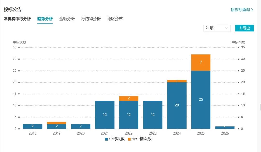 Wind数据显示,2025年宇树科技中标达25次,相较上年增加25%,总投标32次,同比增加52.4%。自2025年至今,其中标采购单位包含电网、电信公司以及大学、美术学院等,投标产品主要为人形机器人系统、多足智能巡检机器人等。