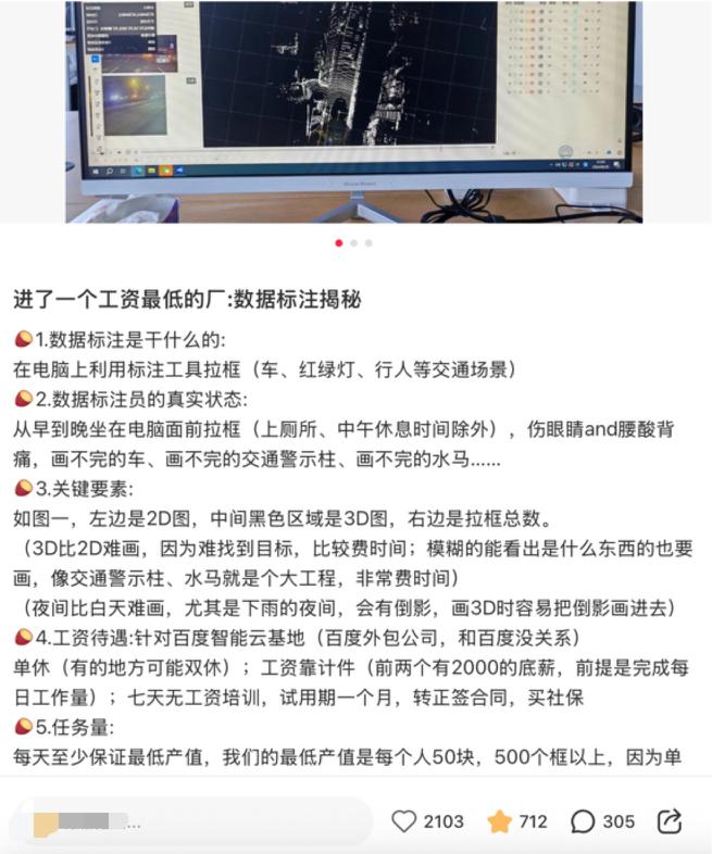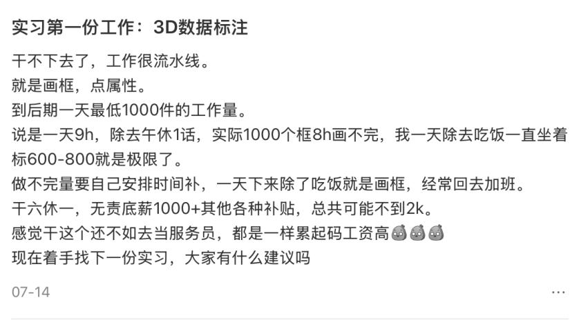 二、三线城市的外包基地里,上百人排排坐,盯着屏幕给图像框选车辆、行人、红绿灯。这类任务门槛极低,无需培训,按件计酬,完成上千张标注收入勉强200元。