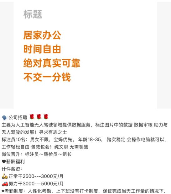 当时的招聘广告内容简单直白:“会用电脑即可”“在家可做”“日结工资”。极低的门槛几乎消除了所有技能壁垒,不需要学历证明,不考察专业背景,只要能分清红绿灯、听清普通话、准确点击鼠标,就能上岗工作。