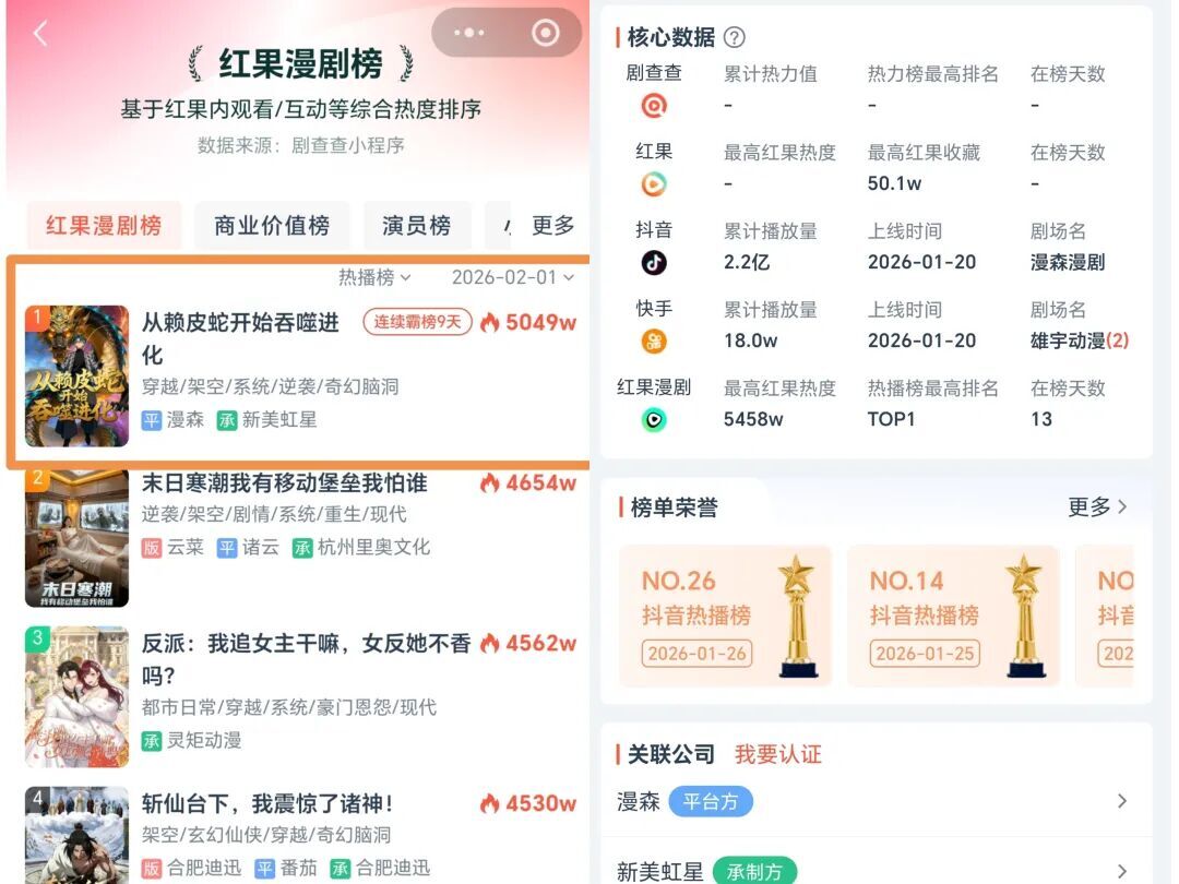2026年漫剧赛道的亮眼开局,被一部脱颖而出的作品提前锁定。在2026年的第一个月,漫剧市场就迎来了首部爆款——《从赖皮蛇开始吞噬进化》。这部作品于1月20日上线,一周内播放总量突破2亿,成为当周抖音端原生漫剧播放增量榜首的新作品,也是今年首部播放量破2亿的新上线精品漫剧。