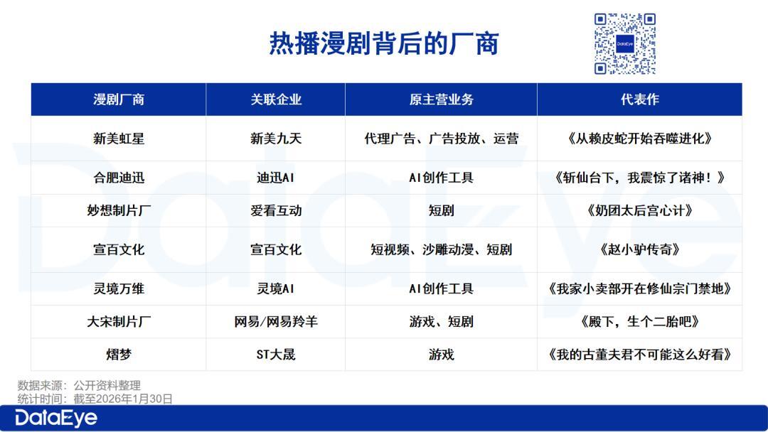 结合DataEye研究院的总结,2026年能在漫剧赛道站稳脚跟的跨界团队主要集中在四类,其核心优势都围绕“漫剧工业化生产”展开: