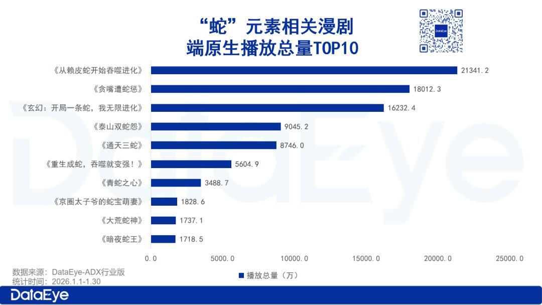 题材红利的集中释放,是《赖皮蛇》能够快速出圈的重要前提,但这并非单纯的“跟风偶然”,而是赛道需求升级的必然结果。截至1月28日,包含“蛇”元素的在播漫剧共有223部,其中今年1月上线的“蛇”元素漫剧达50部,占比22.42%。