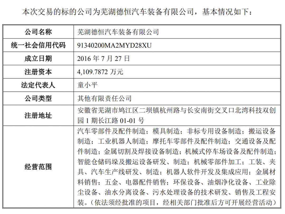 芜湖德恒汽车装备有限公司成立于2016年7月27日,注册资本4109.7872万元,法定代表人为童小平,主要业务涵盖汽车零部件及配件制造、模具制造、非标专用设备制造、工业机器人制造等,注册地址位于安徽省芜湖市鸠江区二坝镇北湾科技双创园。