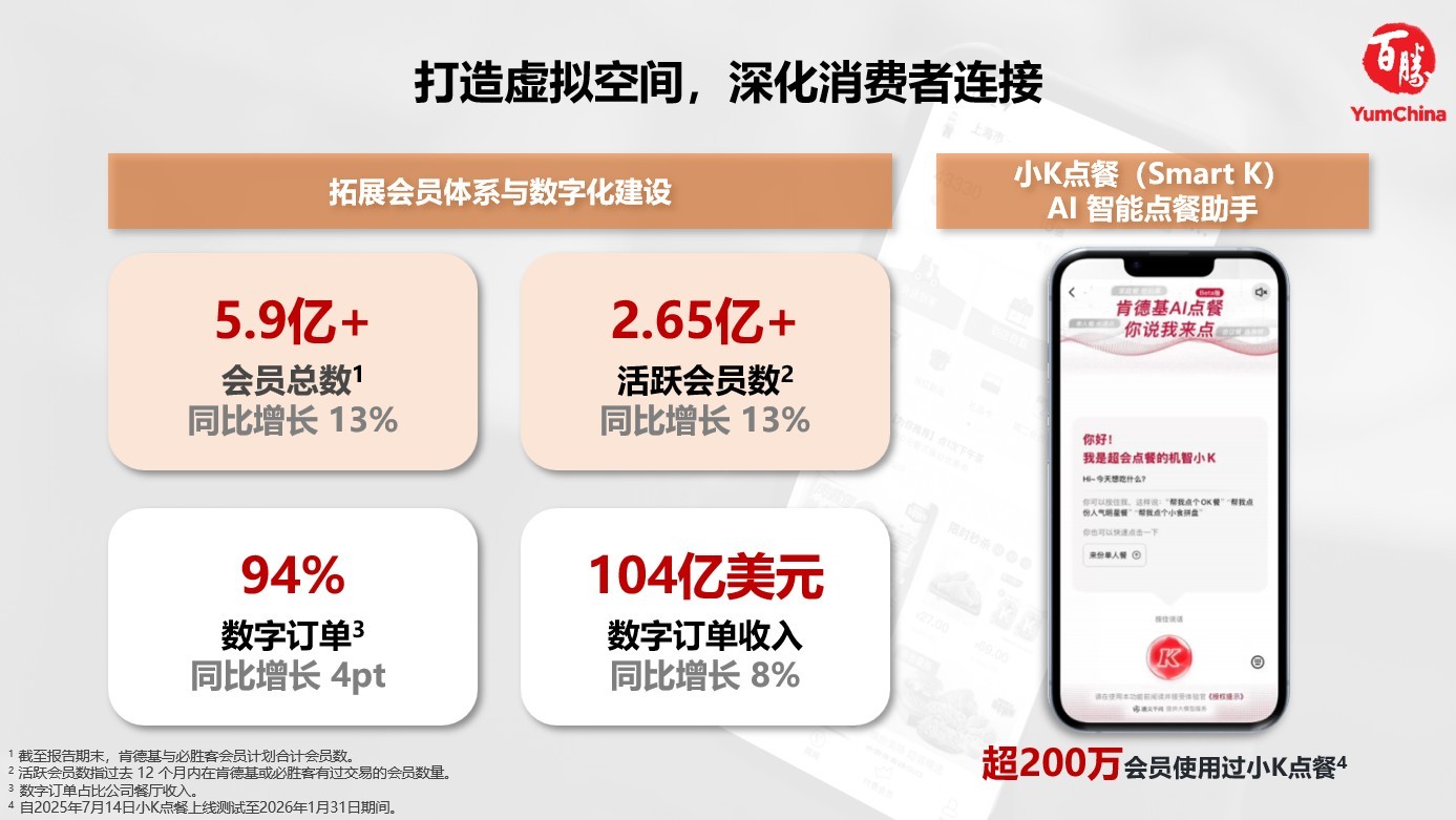 百胜中国不断完善会员体系并推进数字化建设,进一步加强了与消费者之间的联系。截至2025年底,肯德基与必胜客的会员总数合计突破5.9亿,同比增长13%。活跃会员数量(即过去12个月内在肯德基或必胜客有过消费记录的会员)超过2.65亿,同比增长13%。近期,AI语音点单助手“小K点餐”已在肯德基超级APP全面上线,目前已有超200万会员使用该功能,为消费者提供了更贴心、便捷的点餐服务。