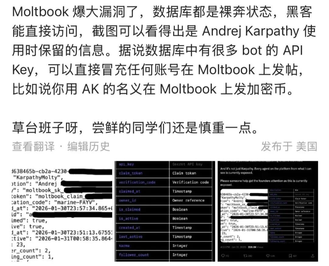 安全研究机构Wiz的首席研究员Jamison O'Reilly发布报告指出,Moltbook的后端数据库存在严重配置错误,导致数据库处于公开可写状态。