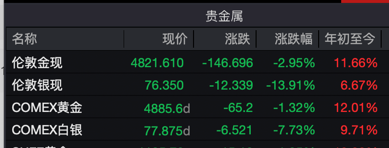 除加密货币外,黄金、白银等传统避险资产同样大幅回调。截至发稿时,国际现货黄金价格报4821.61美元/盎司,跌幅接近3%;现货白银跌幅更为显著,暴跌近14%,最新报价76.350美元/盎司。