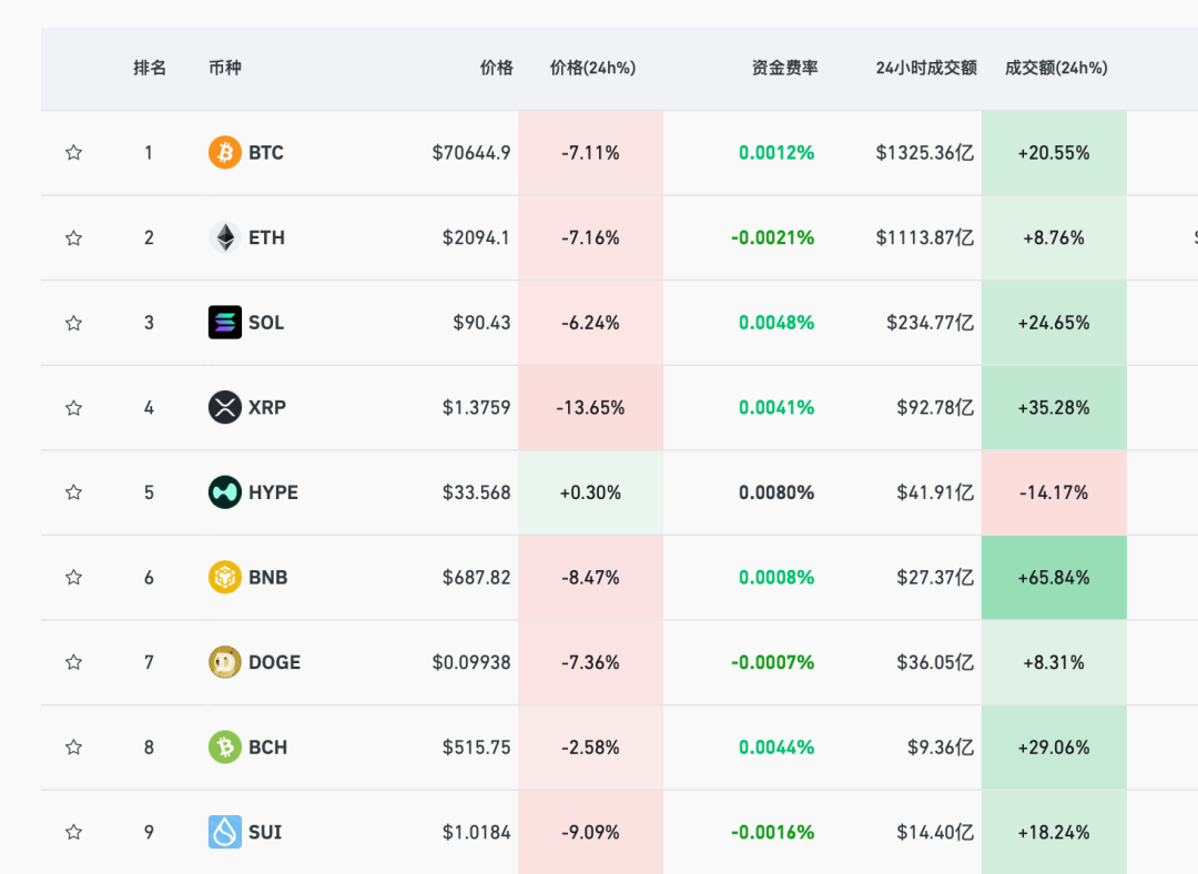 整个加密货币市场同步陷入下跌浪潮。截至发稿,以太坊、DOGE币的跌幅均超过7%,BNB币跌幅超8%,SUI币跌幅突破9%,XRP币的跌幅更是高达13%以上。