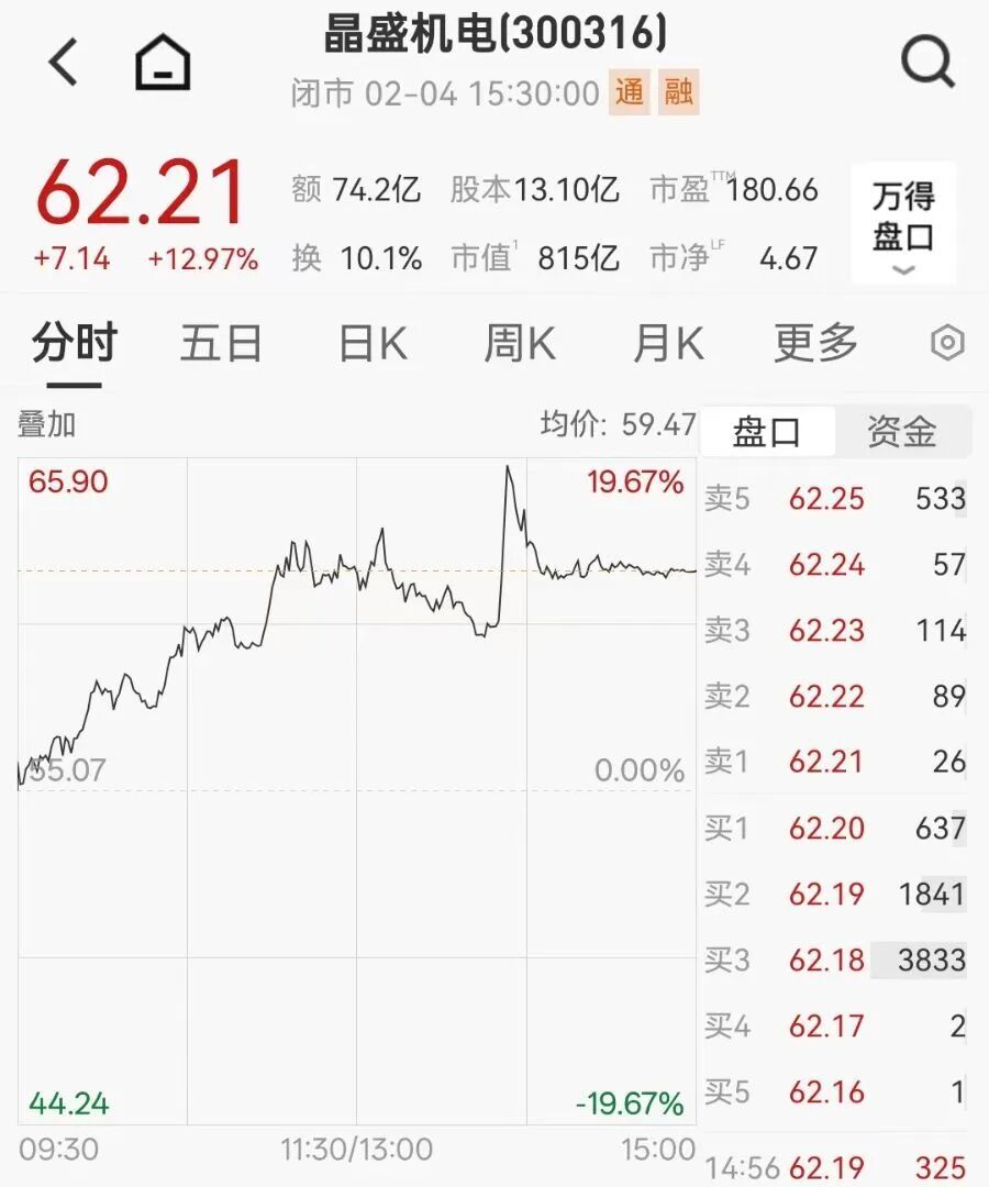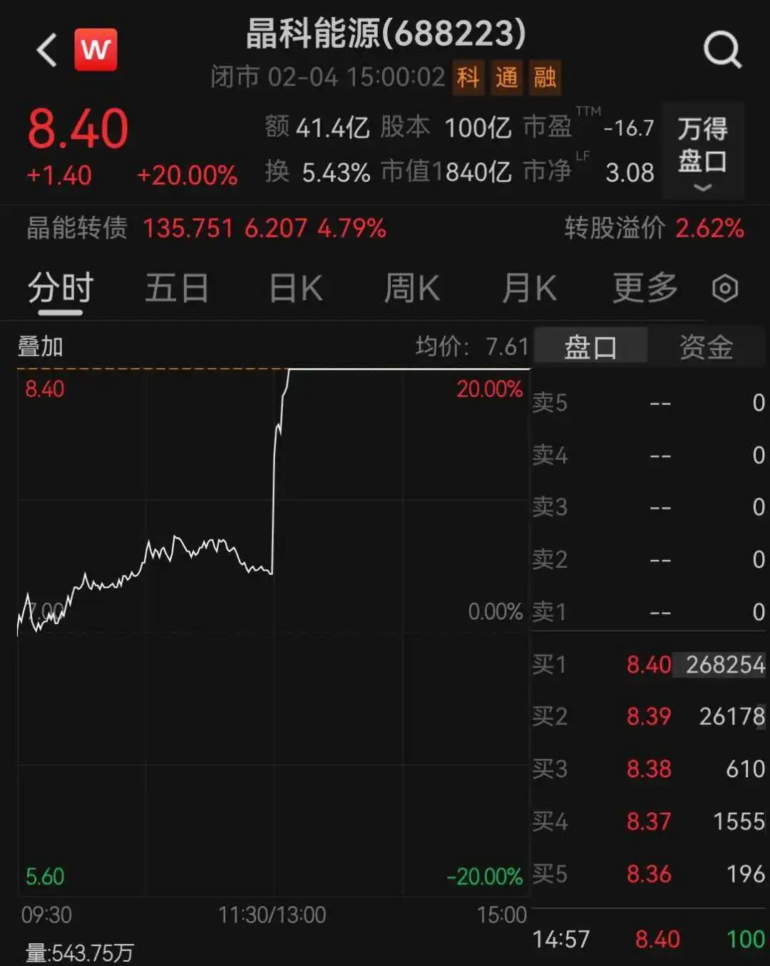 2月4日午后,光伏板块出现冲高走势,其中太空光伏方向表现强势,晶科能源股价迅速拉升至20%涨停。