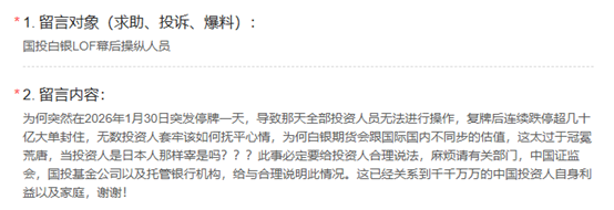 凤凰网投诉消息 截至2月5日股市收盘,国内唯一跟踪白银期货的场内基金——国投瑞银白银LOF已连续四个交易日开盘即跌停,其对应的场外基金净值在2月2日更是暴跌31.5%,此事引发市场广泛关注。