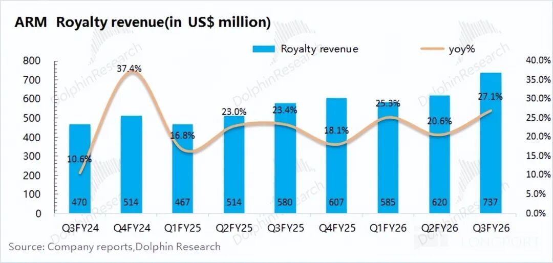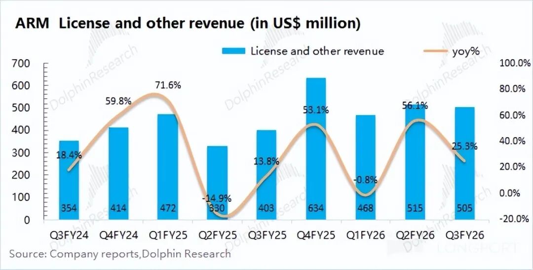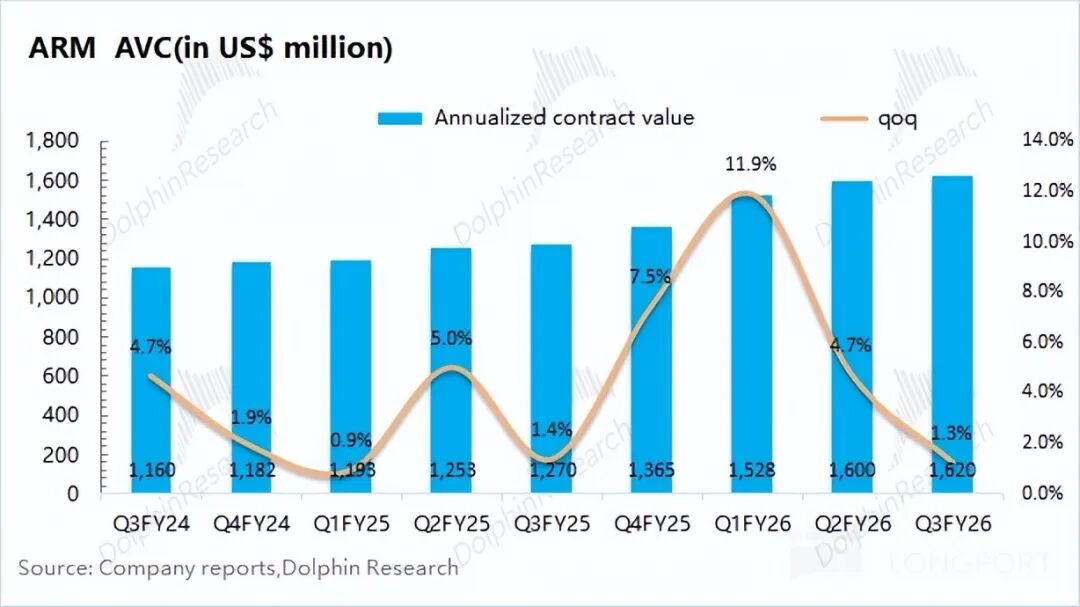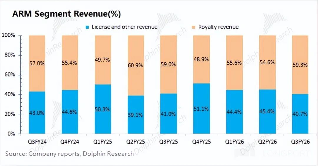 1)管理层指引暗藏隐忧:虽整体营收指引符合预期,但下季度版税收入同比增速预计仅为低双位数(约11-13%),意味着环比将下滑。海豚君认为,手机业务是ARM最大收入来源(占比40-45%),而“存储短缺”严重影响手机厂商备货与出货,将直接拖累版税收入。