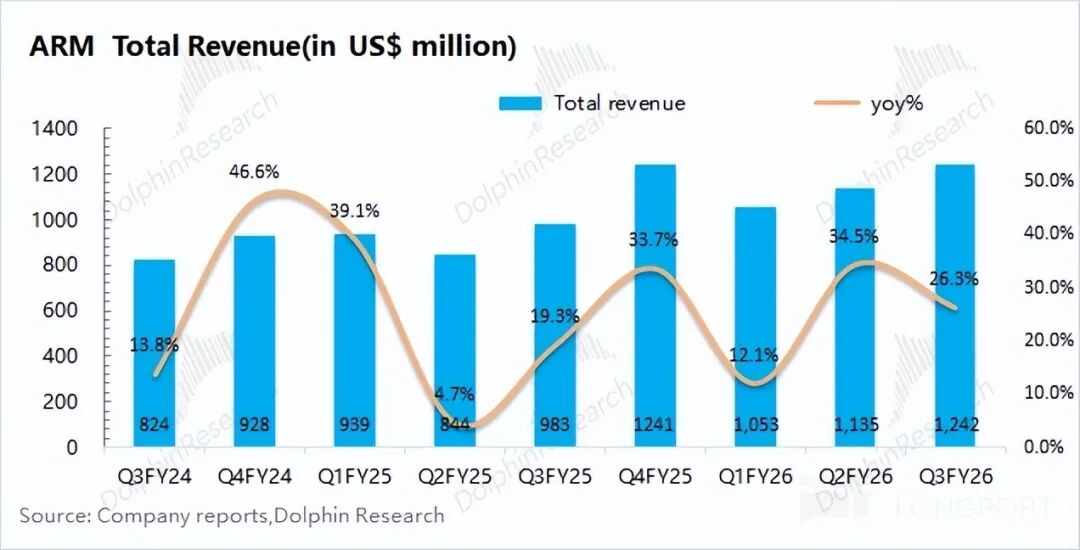 1、核心财务数据:本季度ARM实现营收12.4亿美元,同比增长26%,与市场预期的12.3亿美元基本持平。季度营收环比增加的1亿美元中,版税业务是主要增长动力。公司毛利率高达97.6%,持续维持在97%以上的高位水平。