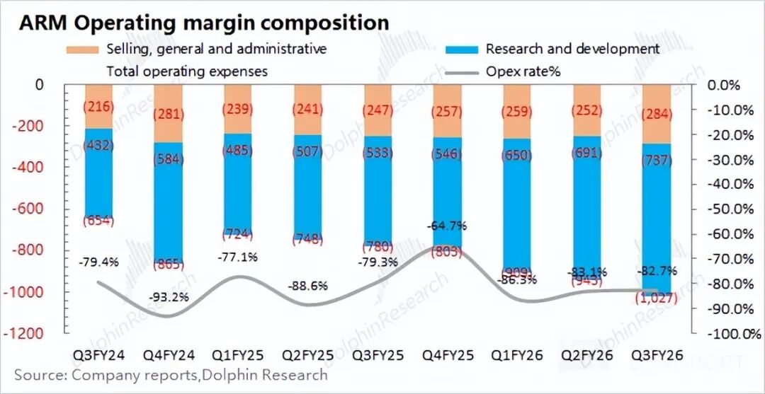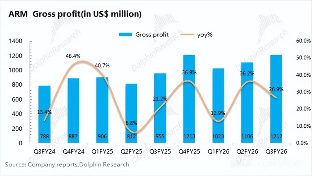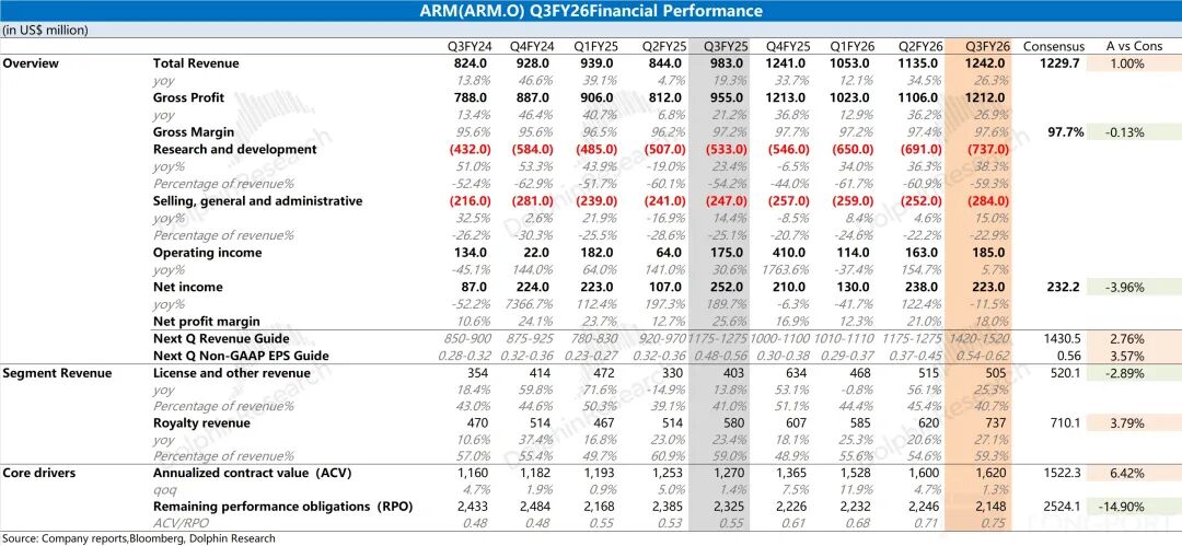 ARM本季度业绩基本符合预期,营收与毛利率均达标,许可证和版税业务增速均超20%。但持续高研发投入(费用率约60%)导致利润有所回落。