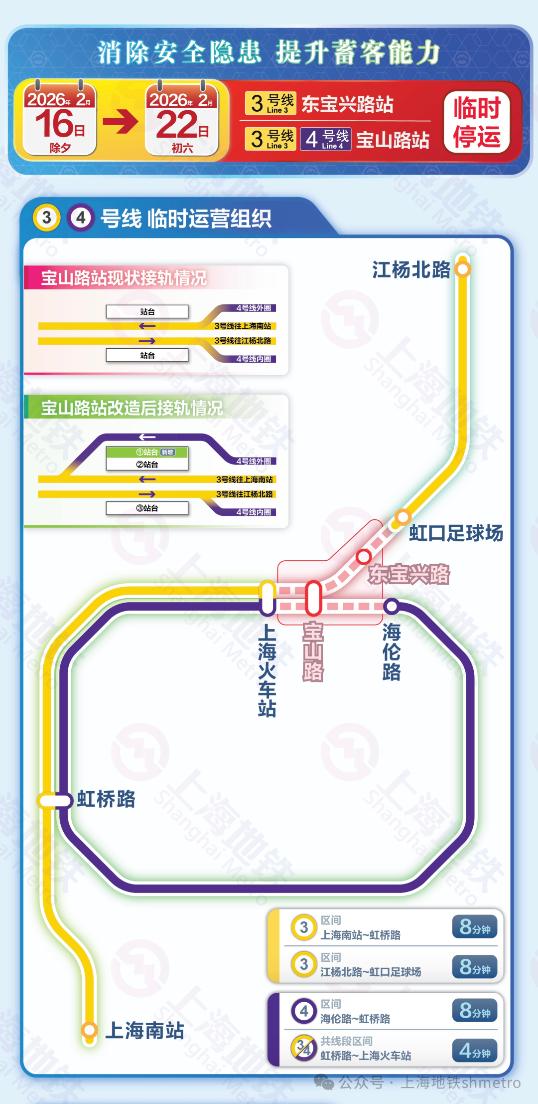 施工停运时间为2026年2月16日(除夕)至2月22日(初六),涉及3/4号线宝山路站和3号线东宝兴路站,这两座车站将暂停运营服务。受此影响,3号线上海火车站站(不含)至虹口足球场站(不含)区段,以及4号线上海火车站站(不含)经宝山路站至海伦路站(不含)区段会临时停运。2月23日(初七)首班车起,3/4号线宝山路站将恢复运营服务。