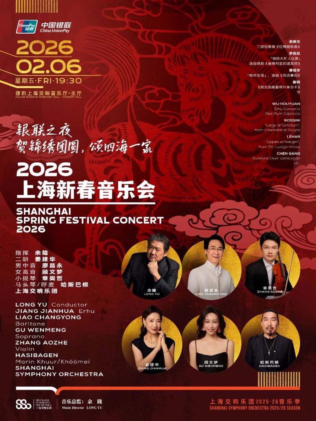 余隆带领上海交响乐团,携手姜建华(二胡)、廖昌永(男中音)、顾文梦(女高音)、章奥哲(小提琴)、哈斯巴根(马头琴/呼麦)登台献艺。音乐会上的每一曲都是年味十足的“硬菜”:廖昌永将演唱咏叹调《快给大忙人让路》,人气新星章奥哲带来小提琴协奏曲《阳光照耀着塔什库尔干》,姜建华则奏响二胡协奏曲《红梅随想曲》。