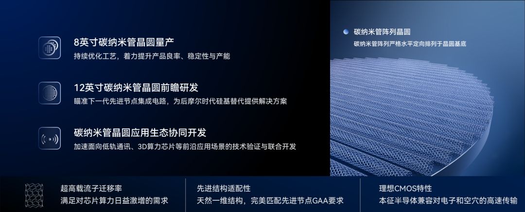 行业内普遍认为,碳纳米管实现产业化的关键在于解决两大核心问题:一是稳定供应晶圆级的高质量碳纳米管材料,二是开发与半导体产线(Fab)兼容的碳纳米管CMOS工艺。作为该领域的创新企业,烯晶半导体能够提供碳纳米管晶圆的全流程解决方案。目前,公司已完成8英寸碳纳米管晶圆的量产验证,成功实现从实验室技术到工程化应用的跨越,并与多家行业头部客户在工艺开发和流片验证方面取得积极进展。而开发兼容主流产线的12英寸碳纳米管晶圆,是公司下一阶段的重要目标,这被视为进入全球半导体制造体系的“入场券”,也是实现产业化的必要环节。