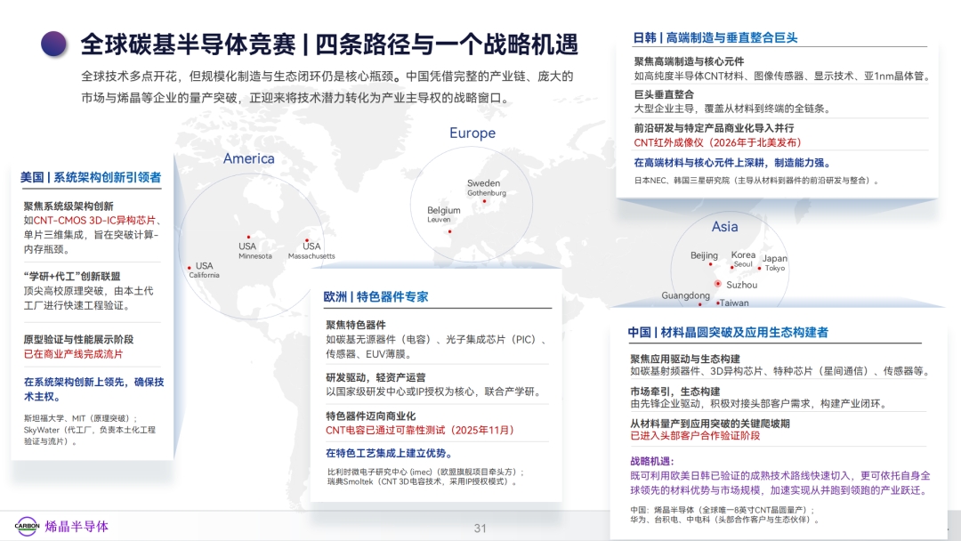 从全球范围来看,碳纳米管产业化的竞争态势已十分明显:美国在CNT-CMOS 3D集成等系统架构领域已完成流片验证;欧洲的碳基电容产品通过可靠性认证后,正加速推进商业化;日韩则在高端器件制造和核心元件(如高性能红外传感器)领域公布了具体的产品发布计划。这些进展共同指向了先进算力芯片、特色分立器件以及光电传感等即将迎来快速增长的市场方向。