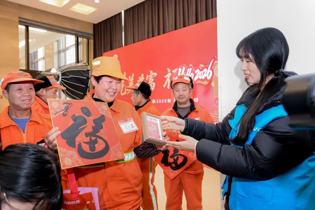 活动特别邀请了200余名杭州市拱墅区天水街道群众代表,以及武林商圈的保安、保洁、销售员、工地工人、快递小哥等一线劳动者参与。艺术家们亲手将福字与装裱好的照片送到大家手中,让基层群众在光影艺术与传统书画里,真切感受到文化的魅力和文艺惠民的温暖。