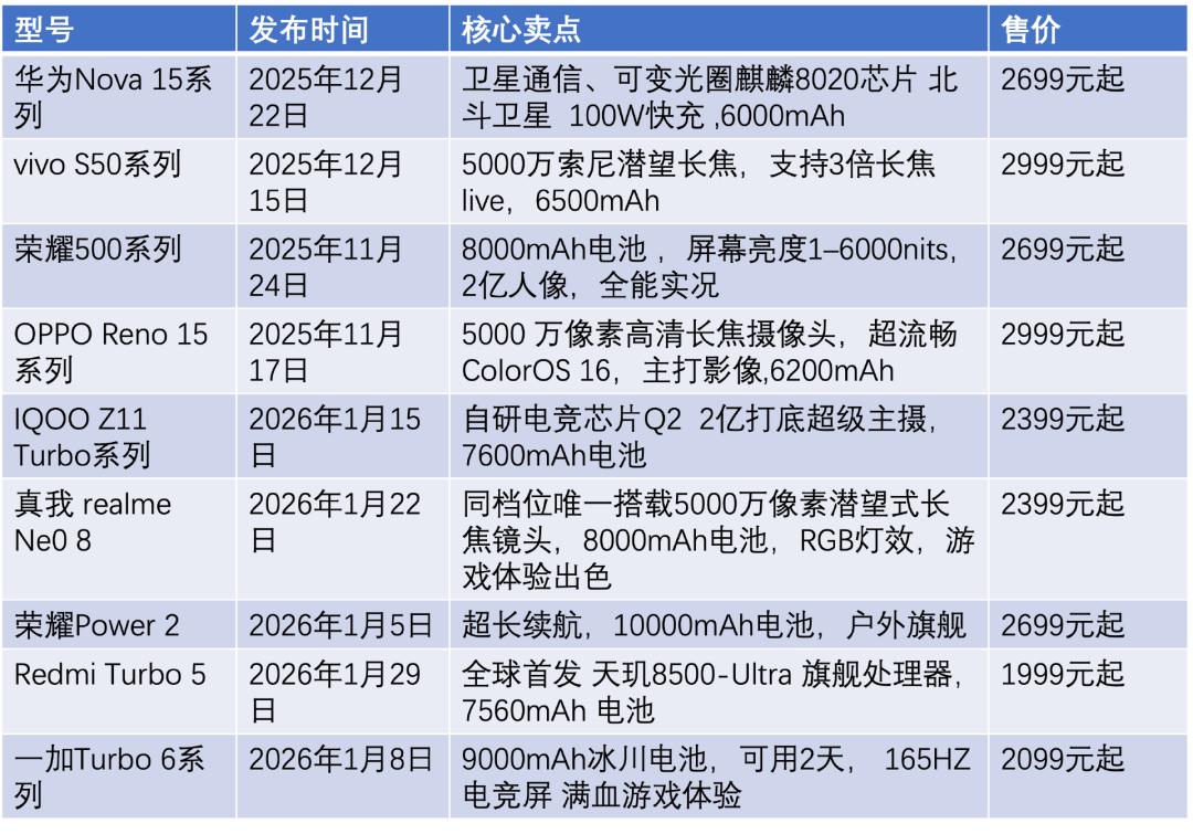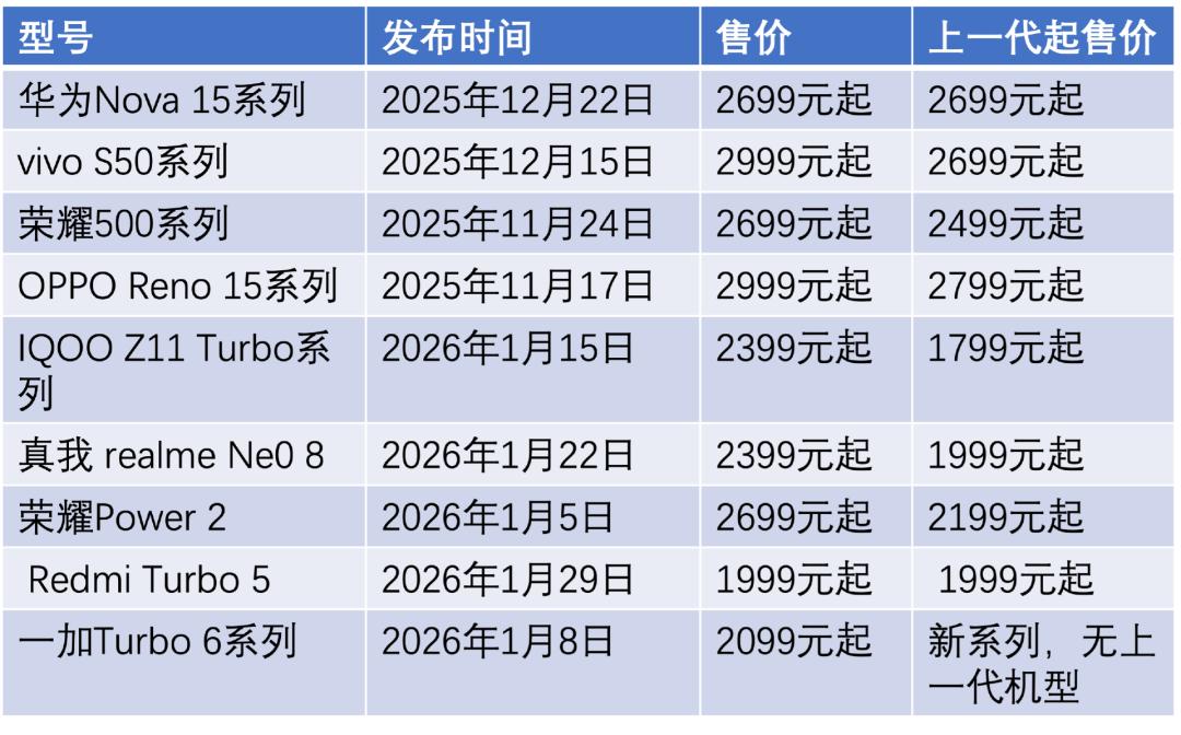 2026年1月,安卓阵营密集发布5款中端机型,几乎每周都有新品亮相——元旦后首周,荣耀Power 2与一加Turbo 6系列便同步上线。厂商们在配置上力求细分场景突破,但多款机型价格上涨,消费者会为这份“诚意”买单吗?