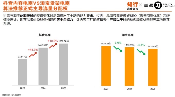 从本质上讲,两大平台构成了消费旅程的不同闭环:淘系承接“确定需求”,完成品牌信任构建和长期复购;抖音挖掘“潜在兴趣”,实现新品类的推广和拉新。这种“人找货”与“货找人”逻辑的共存与互补,共同构成了当前美妆电商流量的主要网络。