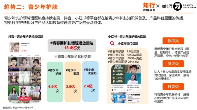 与之不同的是,抖音凭借内容驱动和兴趣推荐逻辑,持续为美妆市场注入增长动力。其整体美妆护肤GMV保持着不错的增长,在青少年护肤等新兴细分赛道更是展现出强大的爆发力。通过场景化内容、知识科普和社交话题,抖音能高效激发用户的潜在需求,尤其擅长推动新品类的普及和新用户的获取。像#青春期护肤#等话题的高播放量,就直接带动了相关品类的认知度和消费转化。