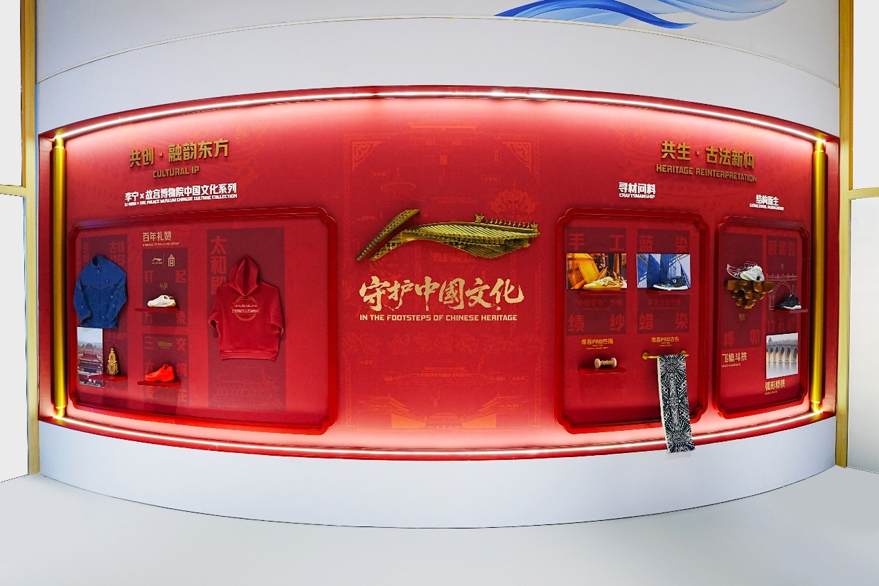 “守护中国文化”主题展区展示了李宁与故宫博物院合作的中国文化系列产品,以及李宁经典鞋款中对中国传统工艺、材料、建筑灵感的运用,通过科技、创新与拼搏精神的融合,推动传统文化的现代表达。