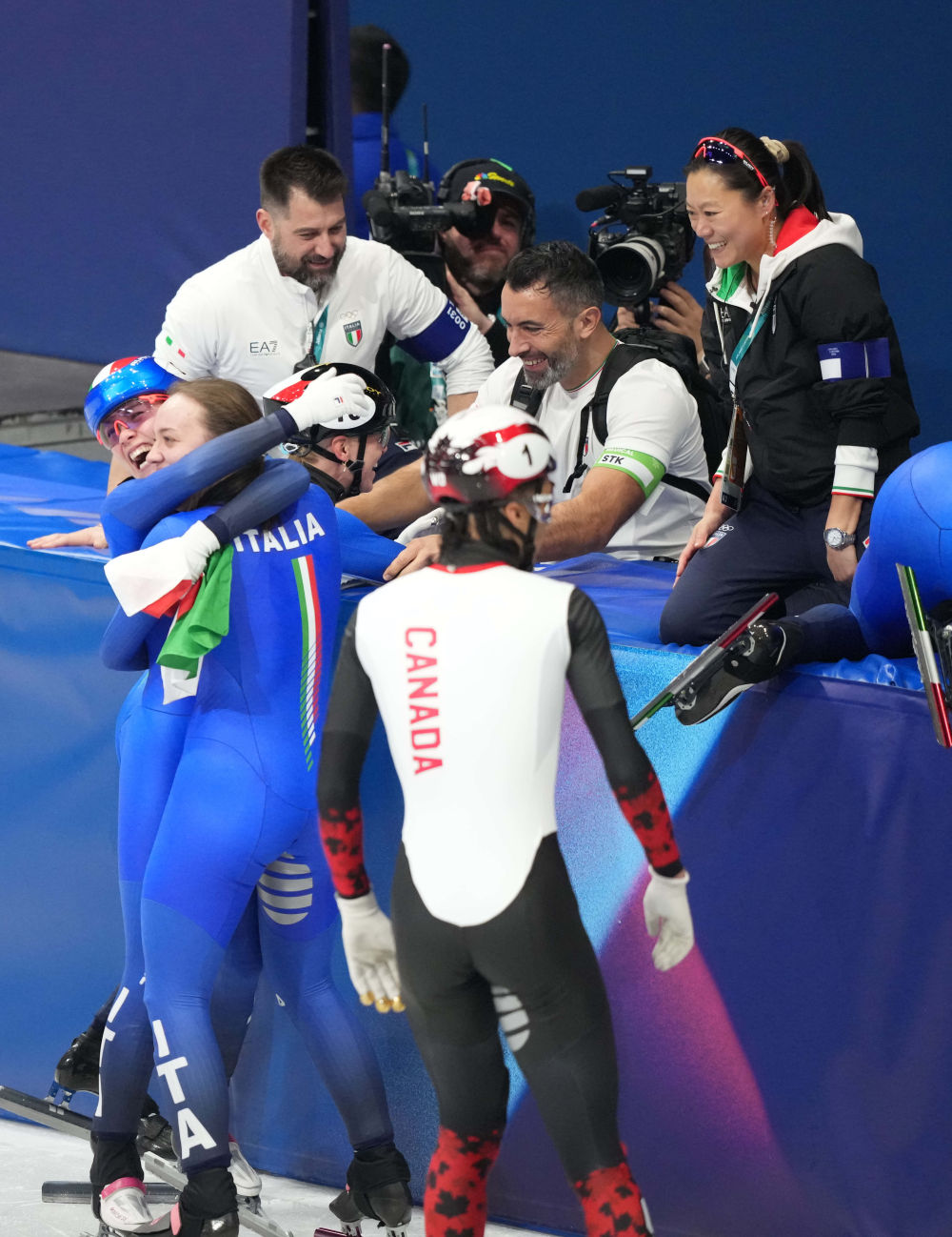 米兰冬奥会短道速滑赛场10日传来捷报,东道主意大利队摘得2000米混合接力金牌,现场瞬间陷入狂欢。在冰场边的庆祝人群里,一张中国面孔尤为亮眼——她眼含热泪,激动地高喊“Italia,brava!(意大利,太棒了!)”,并逐一拥抱队员。