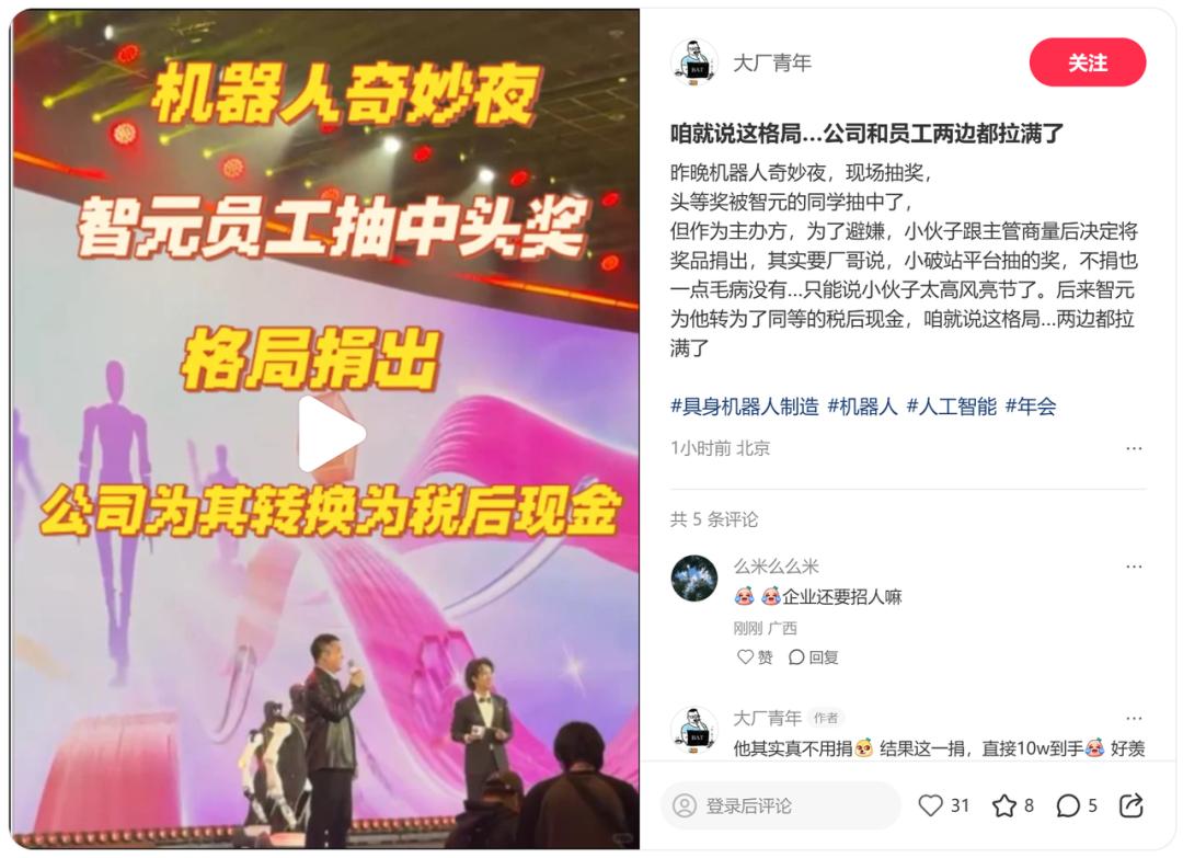 智元员工让出10万汽车大奖 公司年会补发等额税后现金